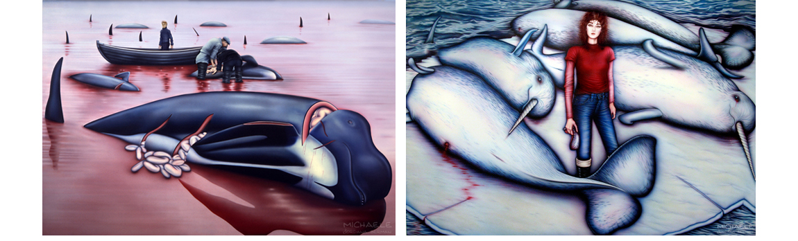 The paintings below - Oceans of Blood and Drifting on Arctic Ice with Muktuk [8’ x 12’, acrylic on canvas] were painted between 1975 and 1992, as part of the original Oceans of Blood series exhibited at The Isaacs Gallery in Toronto. Along with the rest of this series, now in the permanent collections of The National Gallery of Canada and Art Bank, these paintings are examples of photorealism produced during this period. To inquire about prices please contact shop@peakmedia.ca.